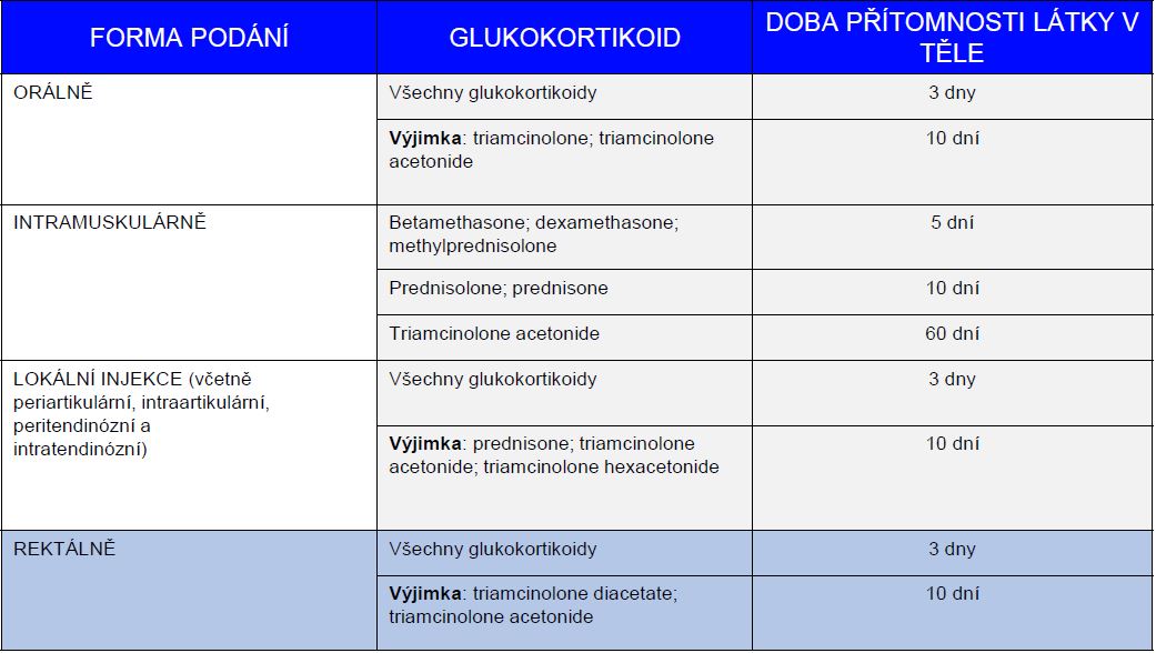 - Následující vysvětlení je přidáno jako poznámka pod čarou k tabulce „Doba přítomnosti glukokortikoidů v těle“ (viz níže): „Použití glukokortikoidových přípravků s prodlouženým uvolňováním může vést k detekovatelným hladinám glukokortikoidů po uplynutí vymývacího období v důsledku prodloužené systémové absorpce.“